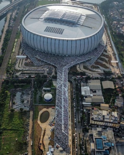Sholat Id di halaman parkir Jakarta International Stadium (JIS) cukup fenomenal. Setidaknya ada sekitar 30 ribuan jama’ah menghadiri sholat Idul Fitri, 1 syawal 1443 H atau bertepatan dengan 2 Mei 2022 itu. Padahal panitia, mempersiapkan untuk 20 ribu jama’ah. Meskipun arus mudik cukup tinggi, namun antusiasme warga Jakarta dan sekitarnya untuk hadir di JIS tidak bisa dibendung juga. Meski masjid-masjid dan beberapa tanah lapang juga melaksanakan sholat Id, tetapo nampaknya JIS memiliki daya tarik tersendiri. Gubernur Anies Baswedan dan beberapa pejabat juga berbaur dengan jama’ah yang berduyun ke JIS tersebut sejak selepas Subuh. Khotibnya KH. Dr. Cholil Nafis, Wakil Ketua MUI Pusat. Sedangkan Imamnya adalah Ustadz Heri Kuswanto yang menjadi juara MTQ Nasional 2018.