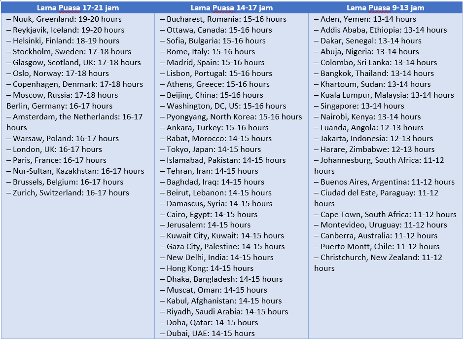 Jika merujuk tabel di atas, maka kita bersyukur berada di Indonesia, “hanya” 12-13 jam dalam berpuasa. Sehingga menjadi mengherankan dan tidak bersyukur rasanya, jika Kita tidak mengoptimalkan bulan Ramadhan dengan mengisinya dengan Ibadah dan memperbanyak amal sholeh.